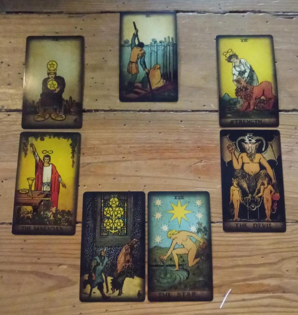 Below is a sample personal reading of these cards. I do not use “reverse” positions in my readings, but those will work just as well with this spread. I am using a version of the Rider-Waite deck here, but if you use a different deck you can adapt the planetary spread to your deck of choice. For this spread, I asked the question “What should I be aware of in my life at this time?”