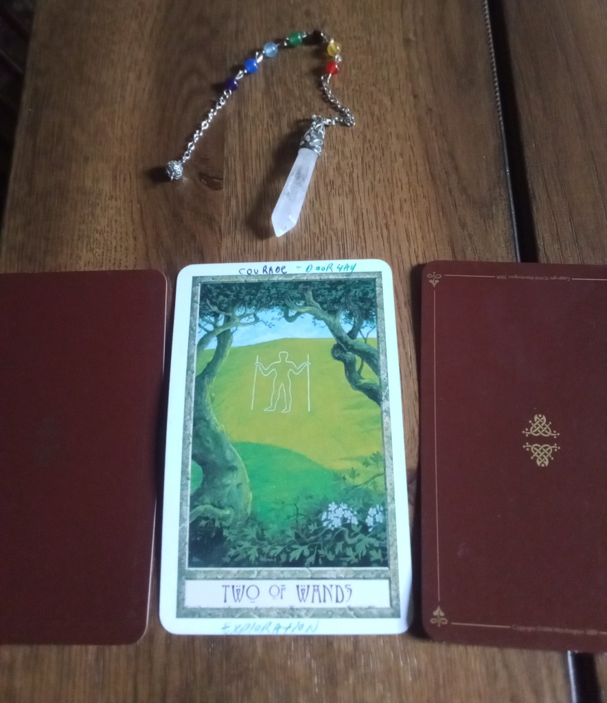 Hover your pendulum still (in other words, don’t move it in circles or anything like that), over each card for about 10 to 20 seconds. Keep your focus on the card you’re looking for, in this case, the Two of Wands. Watch the pendulum very closely for subtle movements. There will be no movement at all, or very little movement over the incorrect cards. As you approach the correct card, the pendulum may start to vibrate or move in small circles. It sometimes does this over the incorrect cards as well, but movements over the correct card will be more defined. Continue hovering the pendulum a few inches above each card while observing any movement. The pendulum needs to “read” each card before it can choose the one you’re looking for. Go from left to right, then right to left, and continue this until you begin to see a pattern. As you move from one card to the next, you will eventually begin to see the pendulum being pulled slightly to the left or the right. It will appear as if an invisible finger is gently directing it toward the correct card. This is exactly how it looks to me. The first time I did this experiment, the pendulum correctly identified all five cards. Since then, my pendulum has become one of my most powerful divinatory tools.